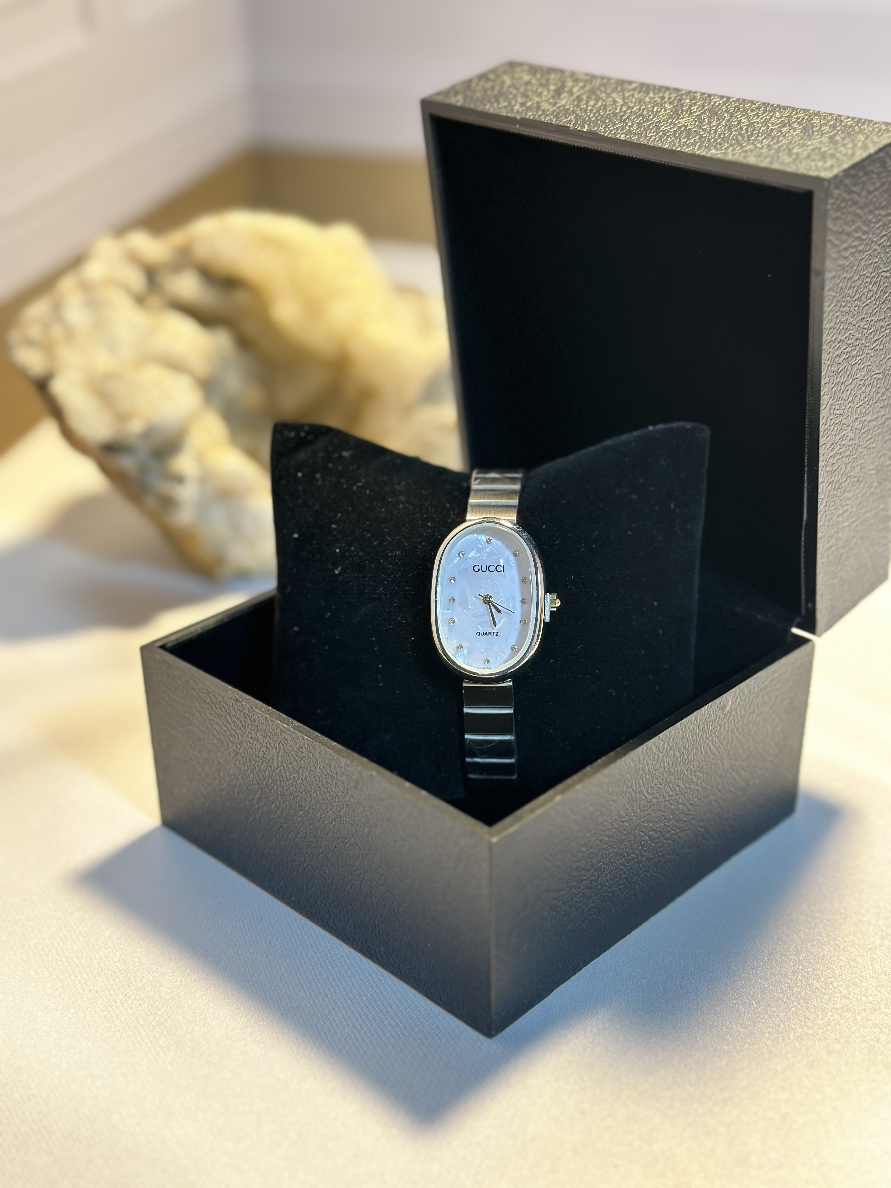 ساعت گوچی با صفحه بیضی کوچک و سه رنگ آبی، سفید و مشکی، طراحی شیک و منحصر به فردی دارد. نگینهای ظریف کنار صفحه، جلوهای لوکس و ظریف به آن بخشیدهاند. این ساعت جمعوجور و زیبا، انتخابی ایدهآل برای استایلهای روزمره و رسمی است که به راحتی با انواع لباسها ست میشود