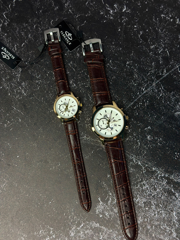 ساعت الگانس ست با بند چرمی قهوهای و قاب طلایی ترکیبی زیبا از طراحی کلاسیک و جلوهای مدرن است. قاب طلایی آن در کنار بند چرمی قهوهای، حس گرما و اصالت را به استایل میبخشد.