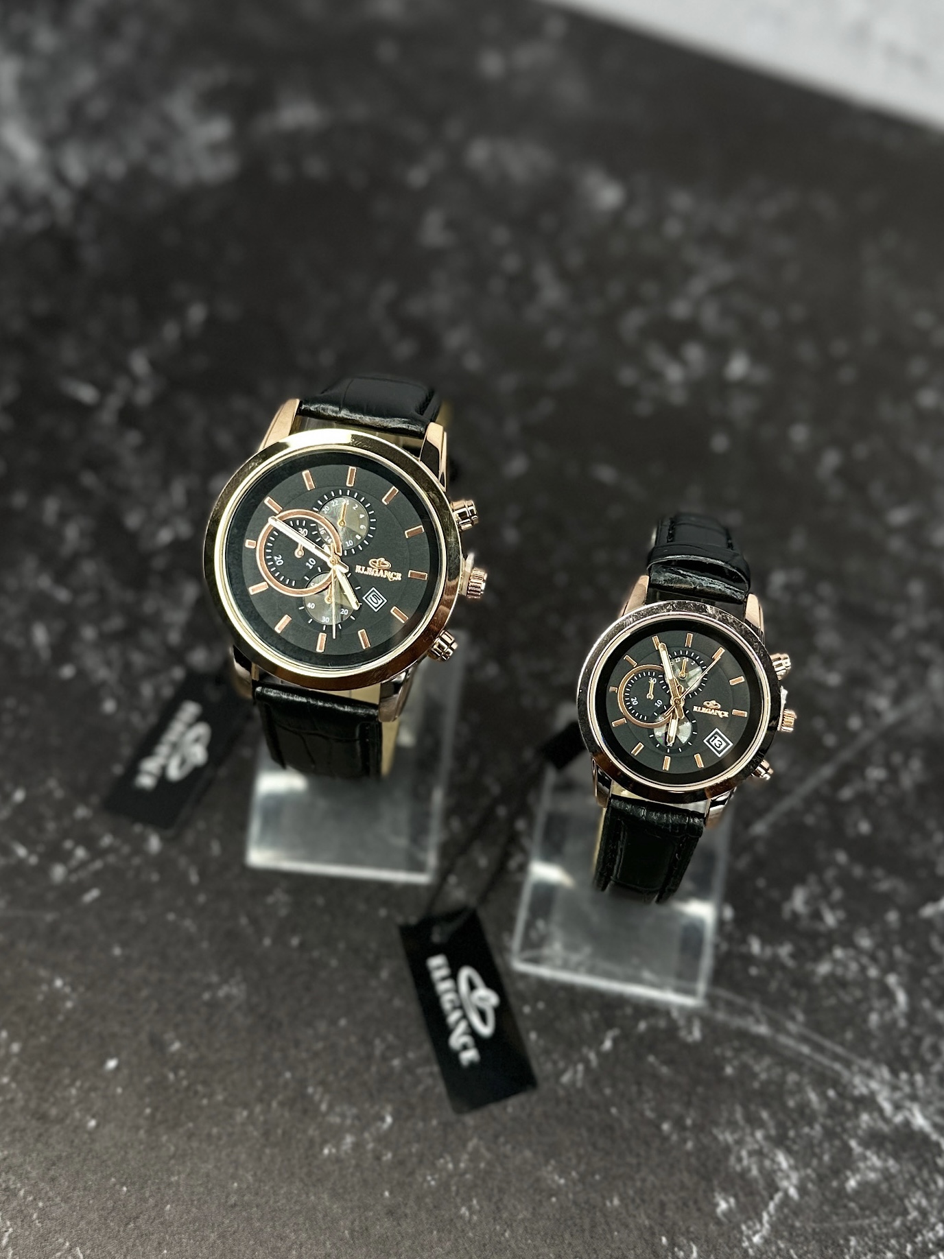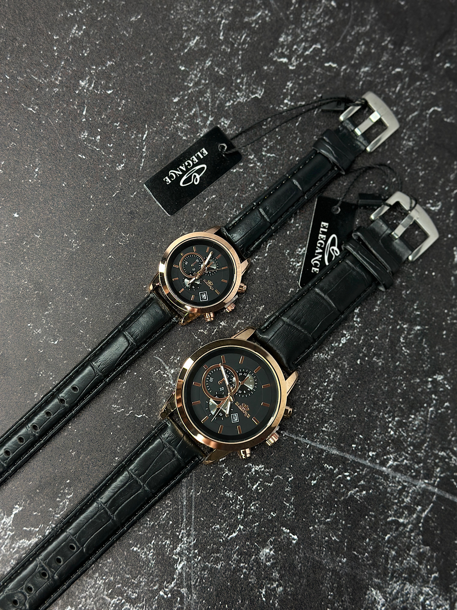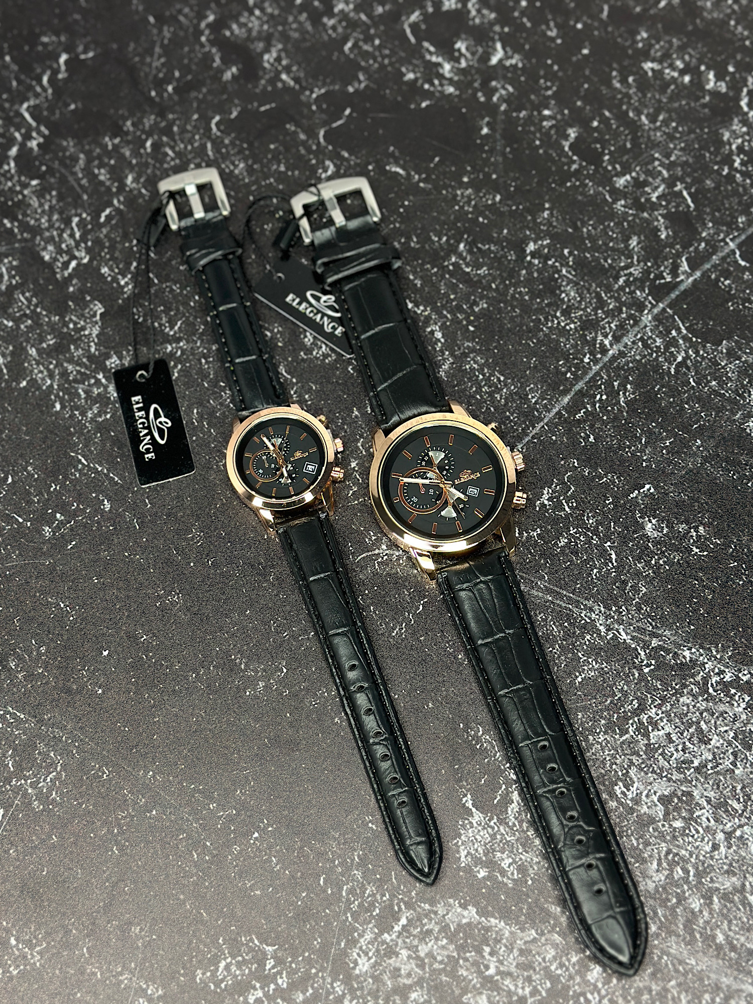 ساعت ست الگانس دسته چرمی مشکی با قاب رزگلد